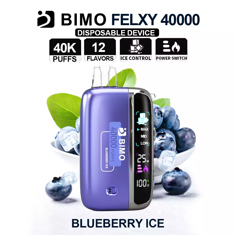 The BIMO Felxy 40000 Kit – Blueberry Ice delivers sweet blueberry flavor with a refreshing icy finish. This high-capacity disposable vape offers smooth vapor, consistent performance, and a rechargeable design for long-lasting, flavorful sessions in a compact, portable device.